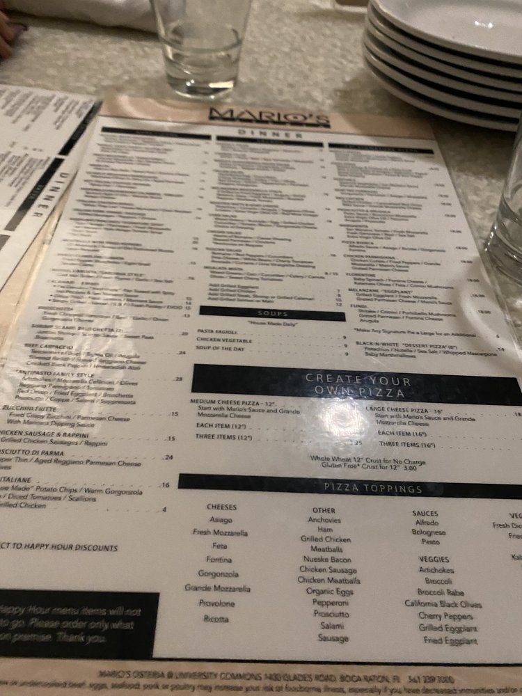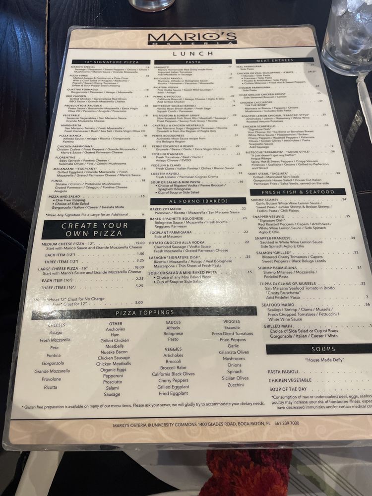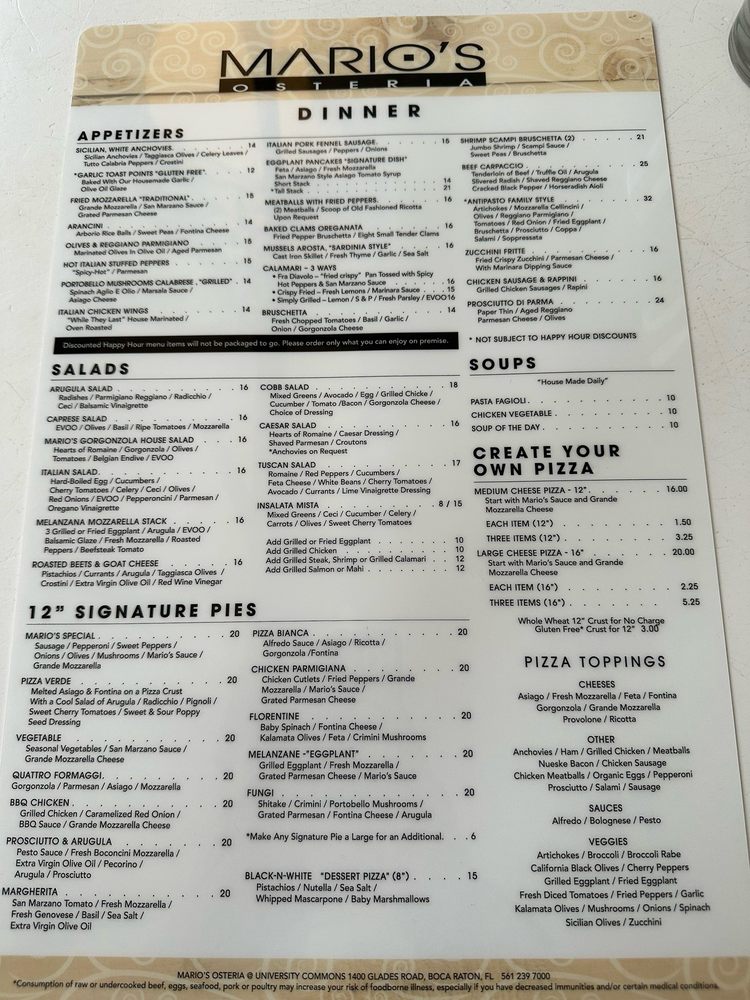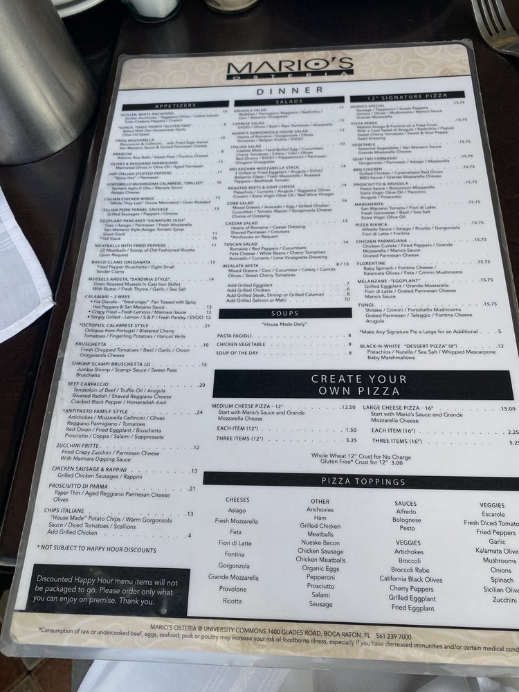 Introducing the menu at Mario's Osteria, a New American, Pizza, and Italian restaurant located in Boca Raton, FL. This trendy spot offers a variety of options, including vegan and vegetarian choices. The menu features Create Your Own Pizza, with options for 12" or 16" sizes and various toppings. In addition to pizza, Mario's Osteria also offers a selection of wine - Sparkling, White, and Red, as well as beer options by the 6 pack. The restaurant provides a casual dining experience with options for reservations, takeout, and delivery. With a full bar, happy hour specials, and free Wi-Fi, Mario's Osteria is a great choice for lunch, dinner, or a night out with friends. The restaurant also offers valet parking, catering services, and is wheelchair accessible for convenience.
