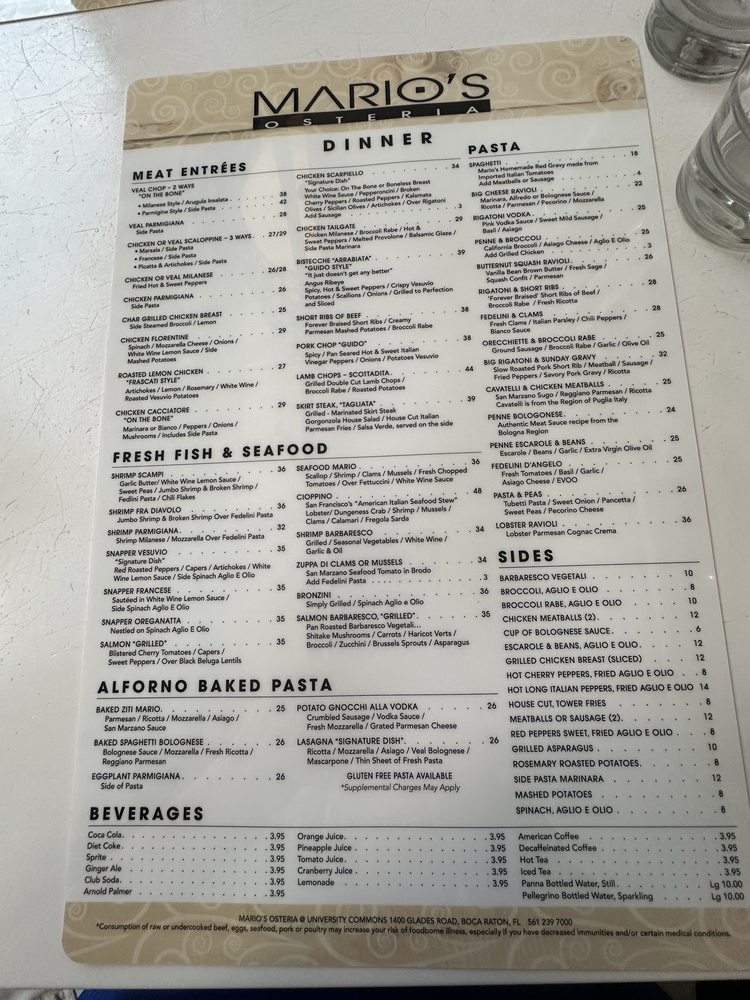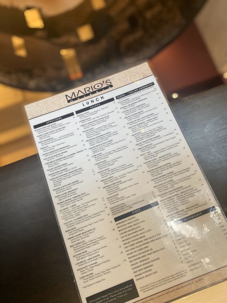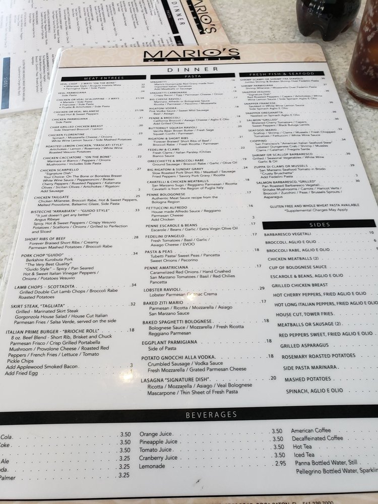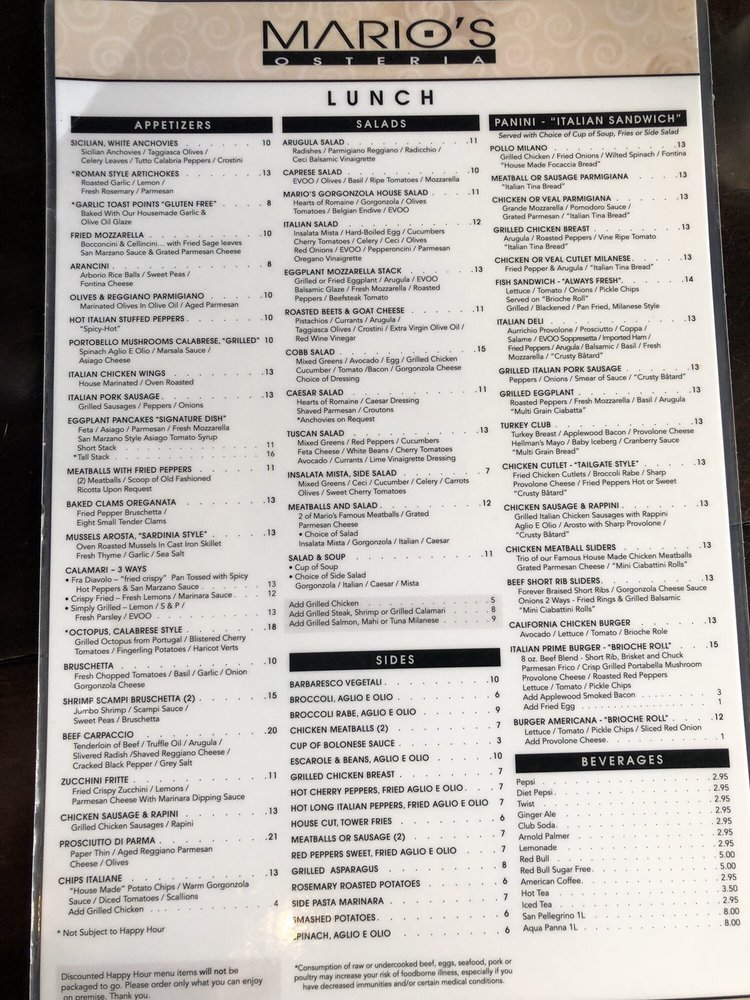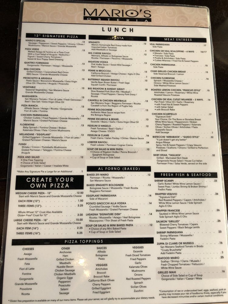 Introducing the menu at Mario's Osteria, a New American, Pizza, and Italian restaurant located in Boca Raton, FL. This trendy spot offers a variety of options, including vegan and vegetarian choices. The menu features Create Your Own Pizza, with options for 12" or 16" sizes and various toppings. In addition to pizza, Mario's Osteria also offers a selection of wine - Sparkling, White, and Red, as well as beer options by the 6 pack. The restaurant provides a casual dining experience with options for reservations, takeout, and delivery. With a full bar, happy hour specials, and free Wi-Fi, Mario's Osteria is a great choice for lunch, dinner, or a night out with friends. The restaurant also offers valet parking, catering services, and is wheelchair accessible for convenience.